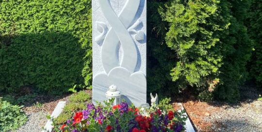 Grabplatte in Marmor Unikat, welches in Zusammenarbeit mit den Kunden entstanden ist.