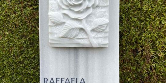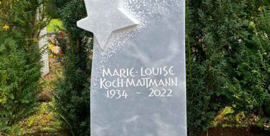 Grabplatte in Marmor Unikat, welches in Zusammenarbeit mit den Kunden entstanden ist.